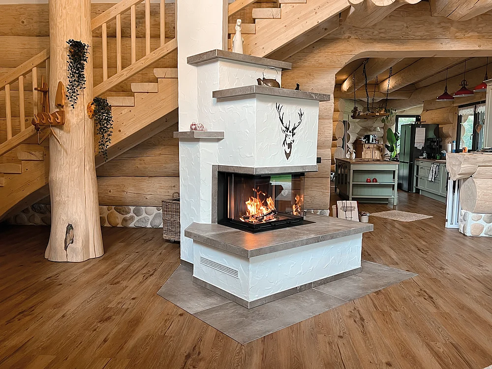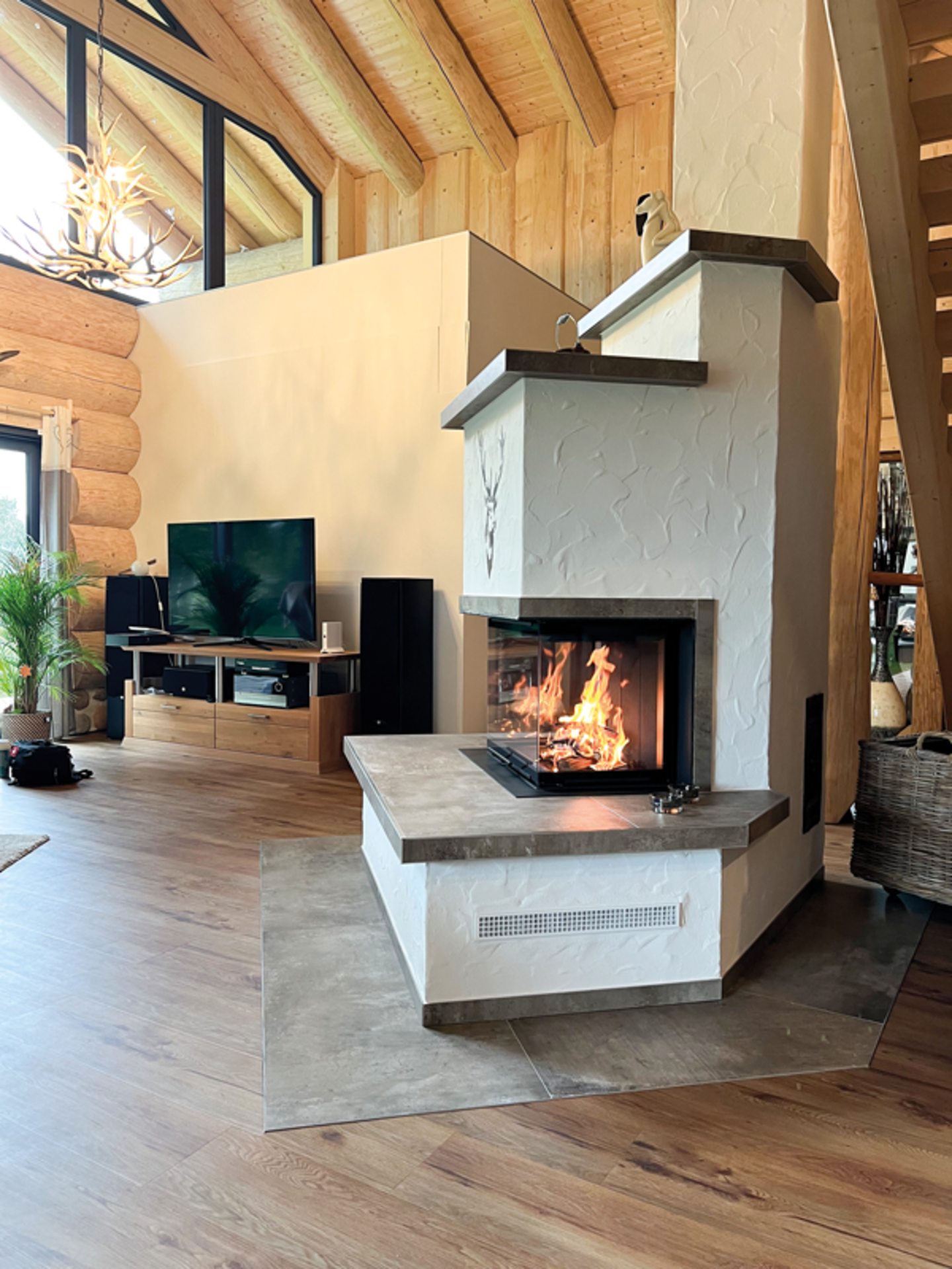 Dieses Haus versprüht von der ersten Sekunde an eine besondere Atmosphäre. Schon die Bauweise ist außergewöhnlich: massive Rundstämme, warmes Holz, kraftvoll und einladend. Im Herzen lodert das Feuer, die sprichwörtliche Sahne auf dem Kuchen. Ein Holzfeuer gehört in ein Naturstammhaus wie Harz ins Holz: Es spendet Wärme, schenkt Geborgenheit und wird zum Ort, an dem Menschen Geschichten miteinander teilen.