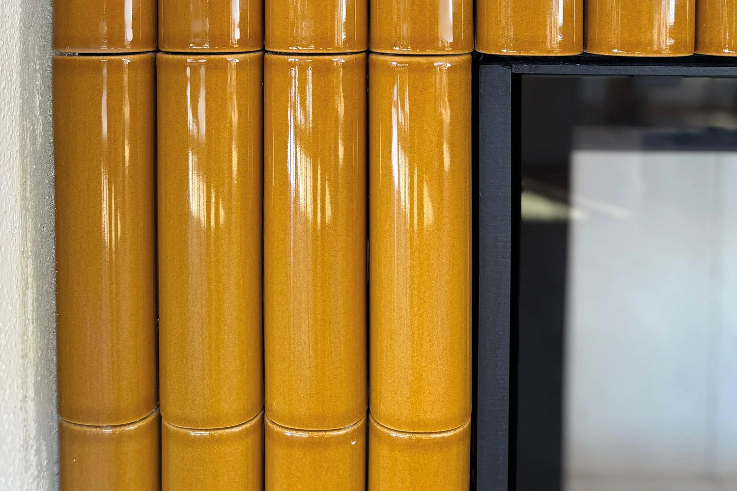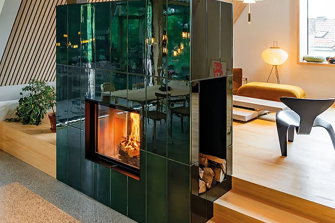 Die keramische Oberfläche dieser Anlage setzt auf Wiederholung und Rhythmus: Schlanke Riemchen in senkrechter Anordnung fassen den Feuerraum Lina 67 ein und lassen die klaren Linien für sich sprechen. Ein individuelles Gestaltungselement mit starker Wirkung im Raum.