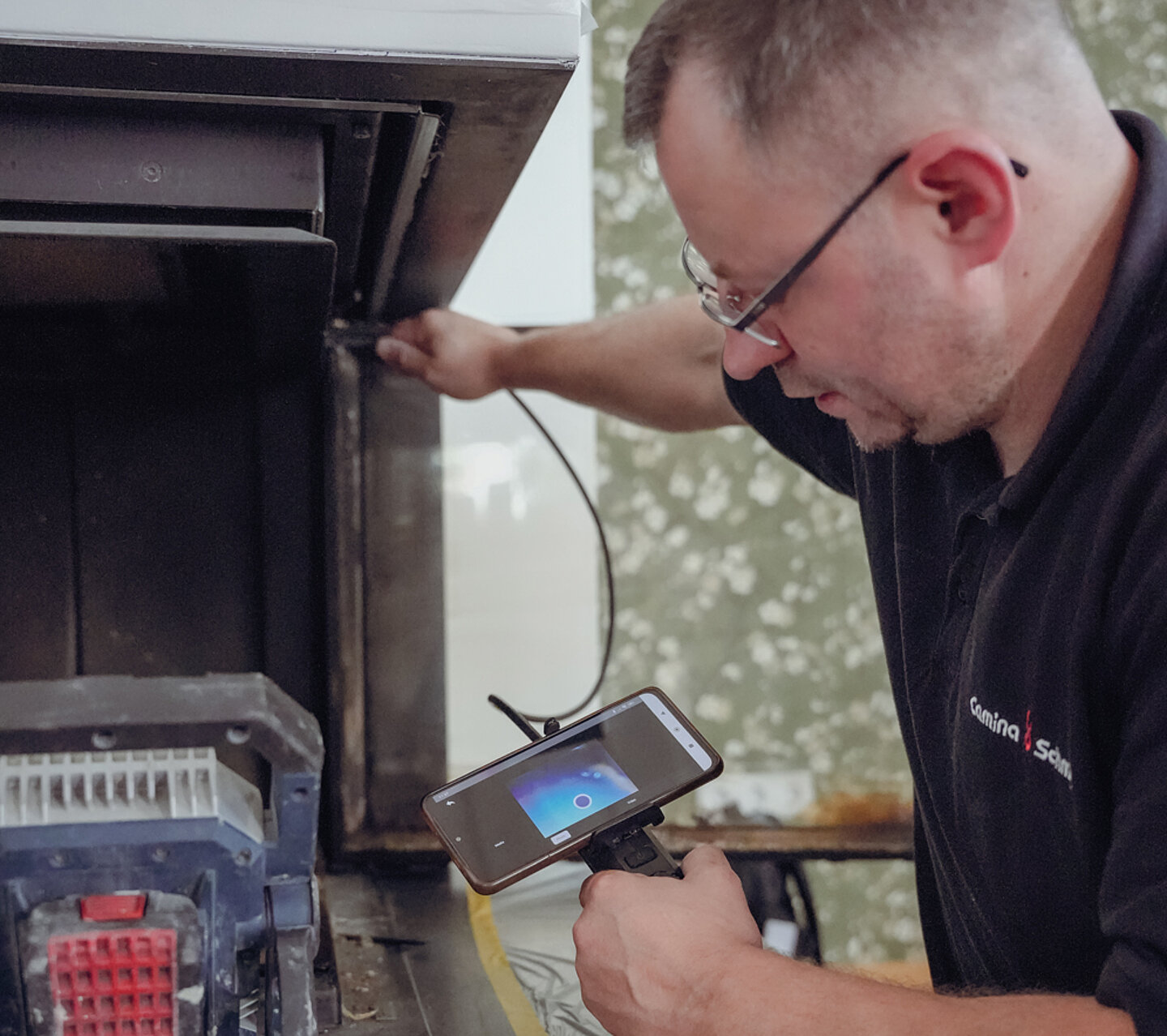 Mit einer Inspektionskamera prüften wir das Abgasrohr auf Beschädigungen, Fremdkörper (zum Beispiel Vogelnester), übermäßige Rußablagerungen sowie auf korrekten Anschluss. Das Rohr war frei und in einwandfreiem Zustand.