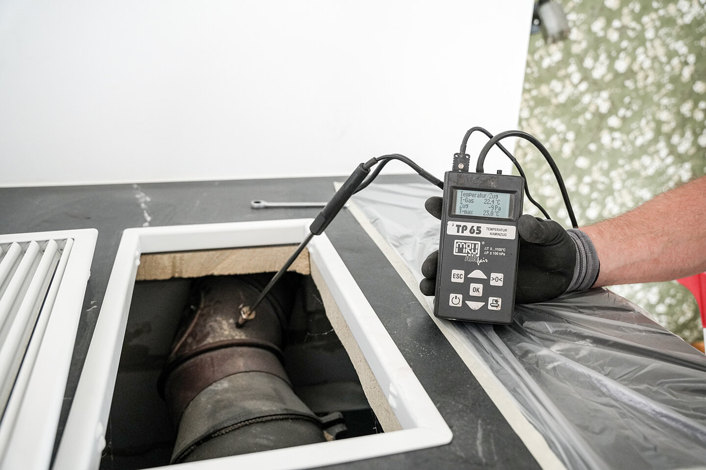 Nachdem alle vorangegangenen Prüfungen keine weiteren Mängel ergeben hatten, stand als letzter Schritt die gemeinsame Befeuerung der Anlage an. Dabei maßen wir zusätzlich den Schornsteinunterdruck und die Abgastemperatur, um deren Aufbaugeschwindigkeit zu beurteilen. Überraschend zeigte sich jedoch ein ungewöhnlich geringer Unterdruck, der in Relation zur mehr als zehn Meter wirksamen Schornsteinhöhe nicht plausibel erschien. Eine erneute Prüfung des Schornsteins brachte schließlich die Erklärung: Die Verbrennungsluftleitung mündete in das Treppenhaus. Dort sorgte ein geöffnetes Fenster im Dachgeschoss für einen unvorhergesehenen Gegendruck, der die Zugverhältnisse im Schornstein massiv beeinflusste. Um diesen Verdacht zu bestätigen, wurde die Verbrennungsluftleitung testweise getrennt – und sofort stellte sich ein stabiler und optimaler Unterdruck ein.