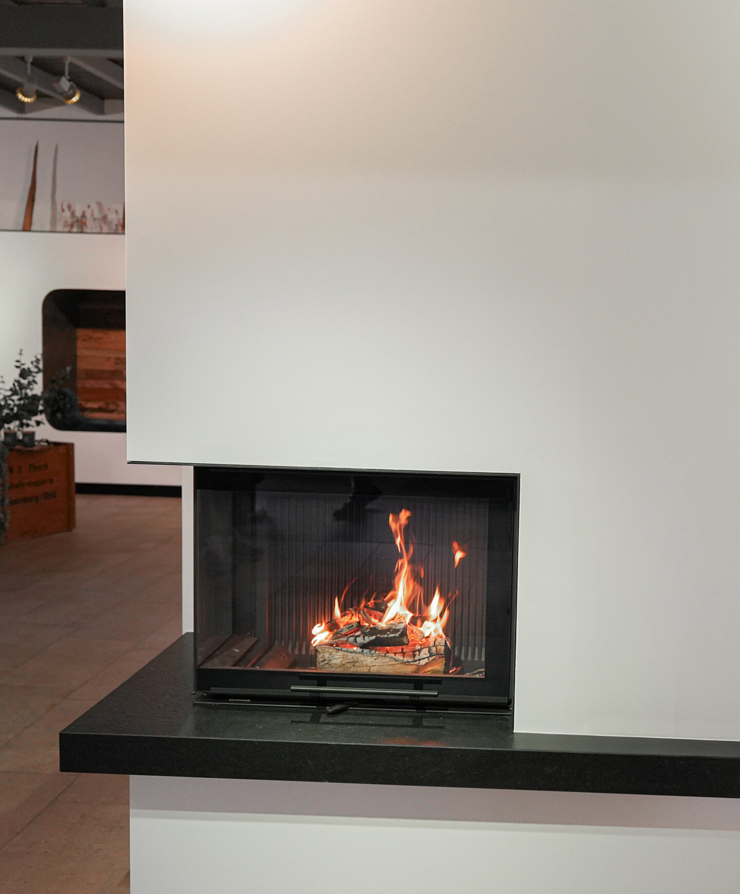 Der Einbau verlief reibungslos: In enger Abstimmung mit unserem Außendienst Udo ließ sich die Anlage zügig aufbauen und direkt in Betrieb nehmen. Besonders überzeugend ist das Flammenbild des evo Kamineinsatzes. Genau deshalb hat die Anlage den Platz gleich im Eingangsbereich der Ausstellung gefunden. Das Objekt selbst ist bewusst schlicht gehalten. Eine schwarze Marmorplatte und verputzte Flächen geben der Feuerstätte eine klare, zeitlose Optik, die viele Kunden anspricht. So rückt das Feuer in den Mittelpunkt, ohne dass das Design überladen wirkt. Dieser Ansatz hat sich in Ausstellungen häufig als besonders erfolgreich erwiesen. Auch die Adera° Abbrandsteuerung fügt sich nahtlos ins Gesamtsystem ein. Die Handhabung ist einfach, die Regelung zuverlässig und im Alltag ein echter Komfortgewinn. Für Verkaufsgespräche bietet Adera° ein starkes Argument: mehr Effizienz, weniger Aufwand für den Kunden und die Sicherheit, dass das Feuer optimal geführt wird.