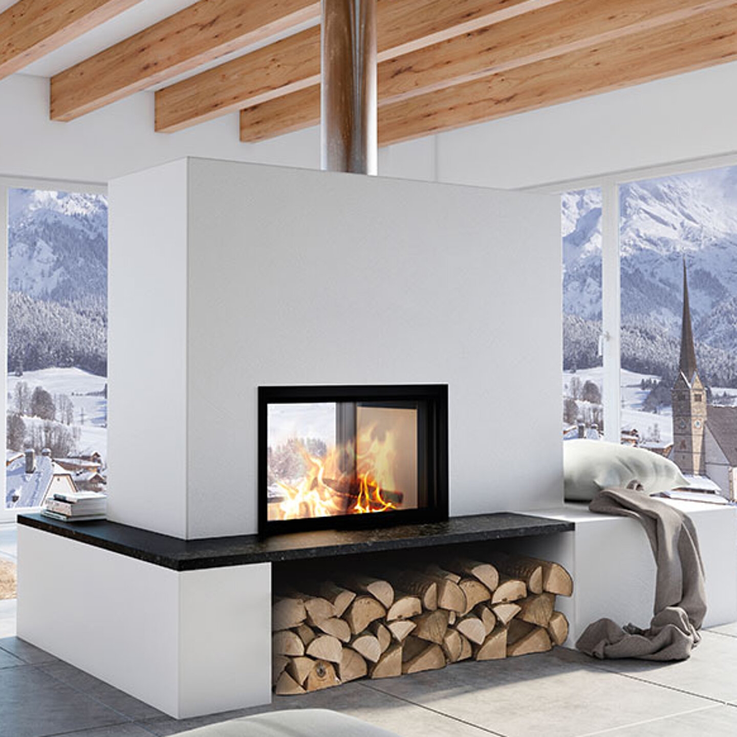 Planen Sie ausreichend Platz und eine geeignete Tragfähigkeit für Kamin und Schornstein ein. Halten Sie Brandschutz-Abstände ein und sorgen Sie für eine sichere Frischluftzufuhr (z.B. Zuluft Rohre in luftdichten Neubauten).