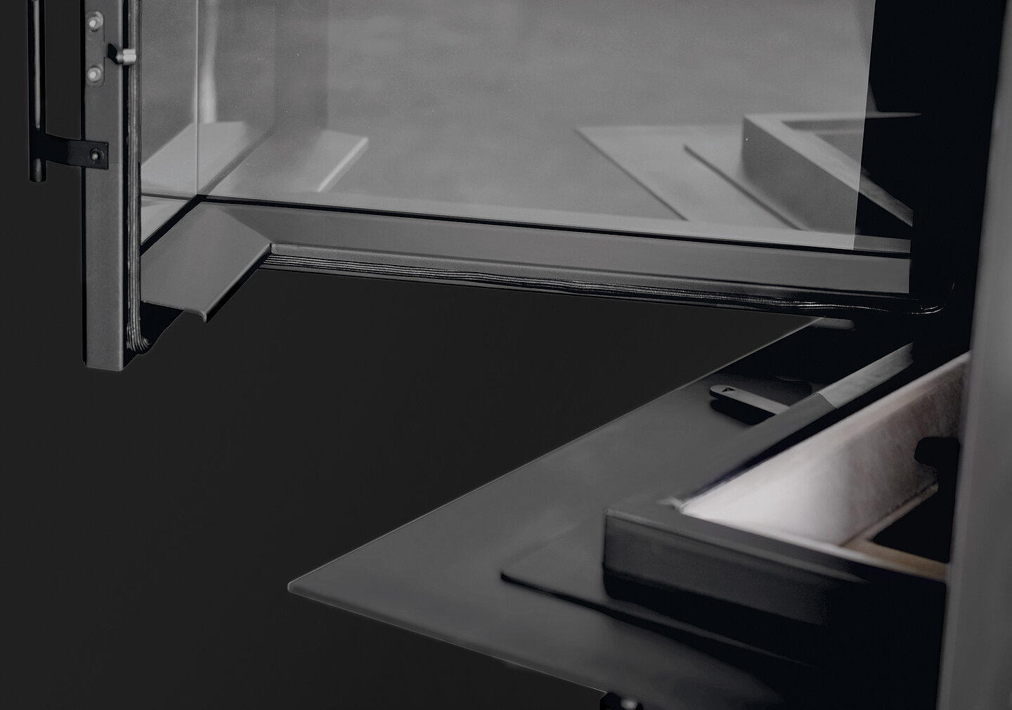 Der Türanschlag der schwenkbaren Grundöfen ist wahlweise links oder rechts angebracht. Mit einer leichten Hebelbewegung öffnet sich die Tür seitlich und verriegelt sich durch einen sicheren Mechanismus wieder.