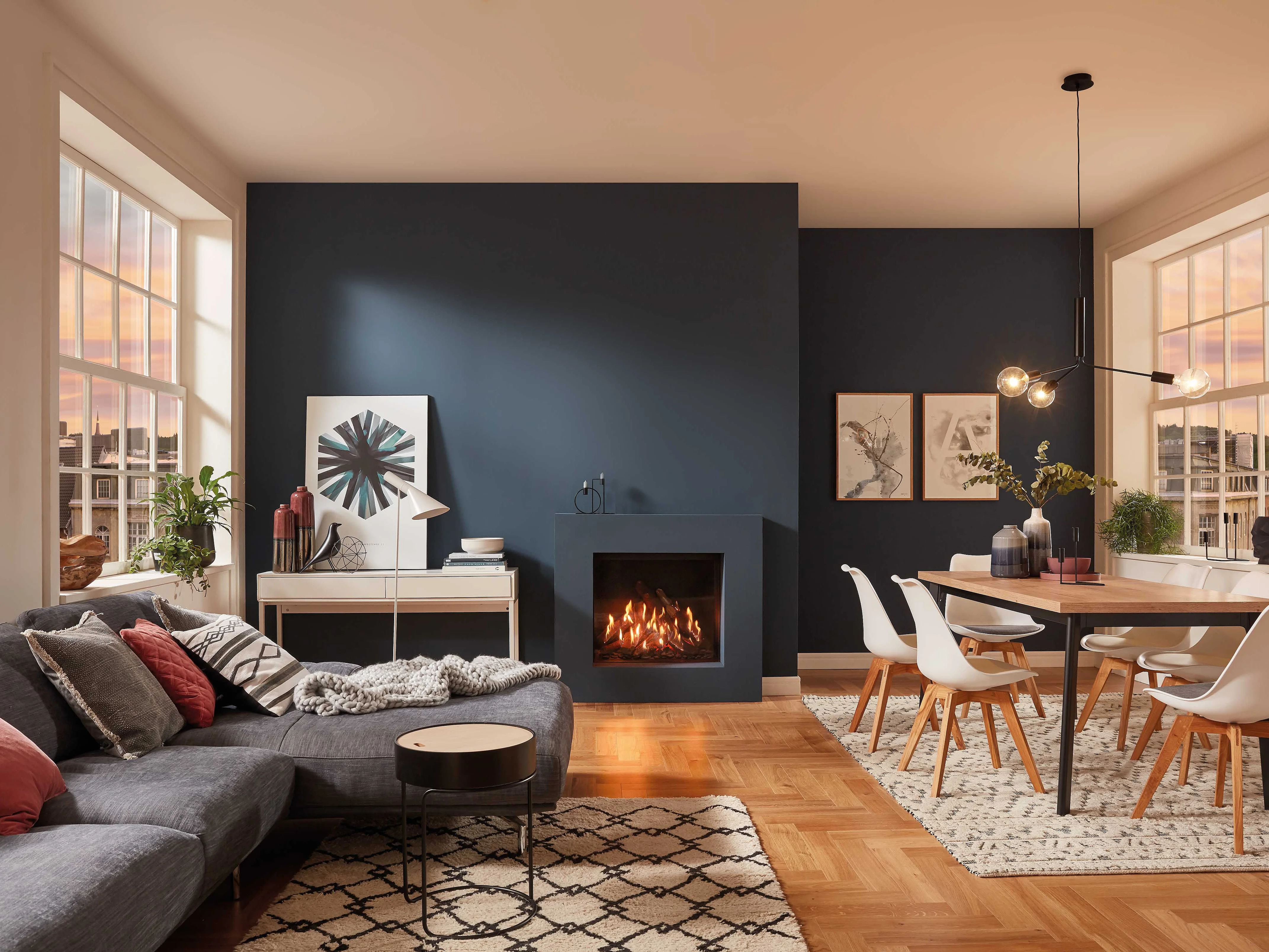 Die Feuerraumrück- und Seitenwände lassen sich mit Stahlblech in anthrazit (matt) oder schwarzer Glaskeramik (glänzend) auskleiden. Die Innenauskleidung aus Glaskeramik spiegelt die Flammen wider und gibt dem Brennraum mehr Tiefe.
