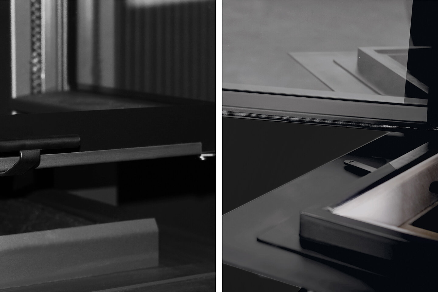 Der Türanschlag der schwenkbaren Variante ist wahlweise links oder rechts angebracht. Mit einer leichten Hebelbewegung öffnet sich die Tür seitlich und verriegelt sich durch einen sicheren Mechanismus wieder. Bei der hochschiebbaren Variante gleitet die Tür sanft und mühelos nach oben und lässt sich gedämpft schließen.